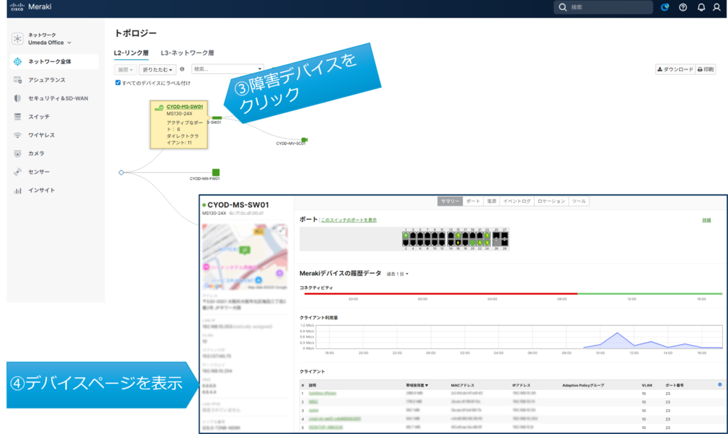 ③障害時には該当デバイスをクリックすることで、④デバイスの詳細ページへ移動できます。