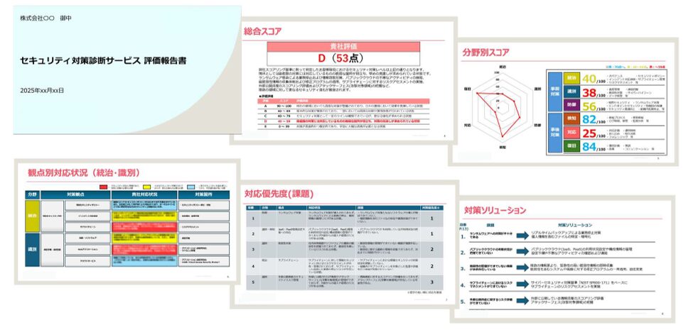 | ・ヒアリング回答結果に伴う評価報告書の作成を行います ・評価報告書にはセキュリティ対策状況のスコア、各課題の対応状況と対策ソリューションを記載します ・作成した評価報告書には報告会後に納品を行います |